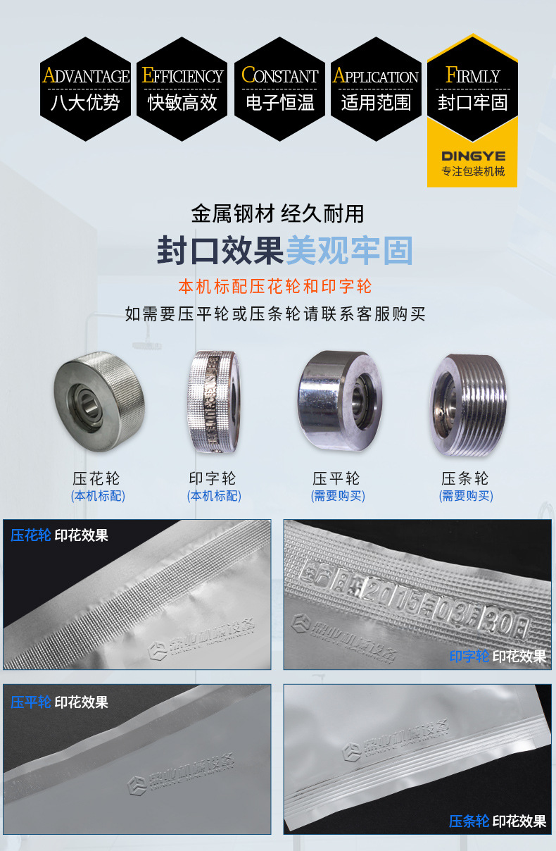 - 針對鋁箔材料或者鋁箔復合包裝材料設計。鋁箔具有良好的阻隔性,能有效防止氧氣、水分等進入包裝內部。這種封口機可以確保鋁箔包裝的密封性,常用于食品、藥品、保健品等行業,如藥品的鋁箔泡罩包裝的封口。