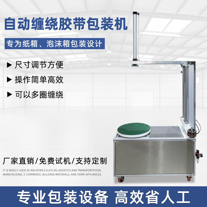 - 貨物纏繞機(jī):主要用于托盤(pán)貨物、大型設(shè)備等的包裝,通過(guò)旋轉(zhuǎn)工作臺(tái)帶動(dòng)貨物旋轉(zhuǎn),同時(shí)膠帶從上方或側(cè)面進(jìn)行纏繞,如常見(jiàn)的物流倉(cāng)儲(chǔ)用膠帶纏繞機(jī)。