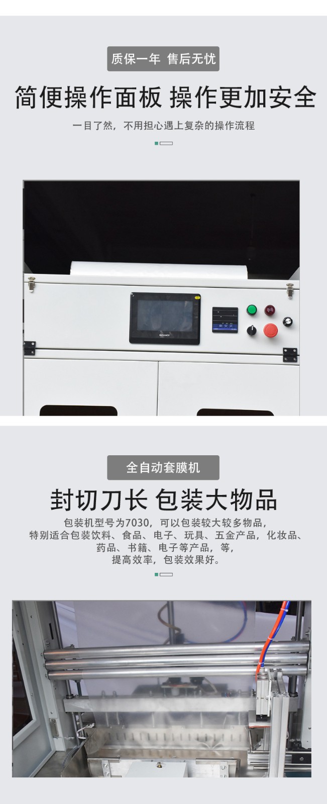 - 自動化控制系統:采用先進的可編程邏輯控制器(PLC)等控制系統,能夠自動調節套膜過程中的各種參數,如薄膜張力、套膜速度、產品輸送速度等。這些參數可以根據不同的產品和包裝要求進行預先設定,設備在運行過程中會自動按照設定值進行工作,保證了包裝質量的穩定性。