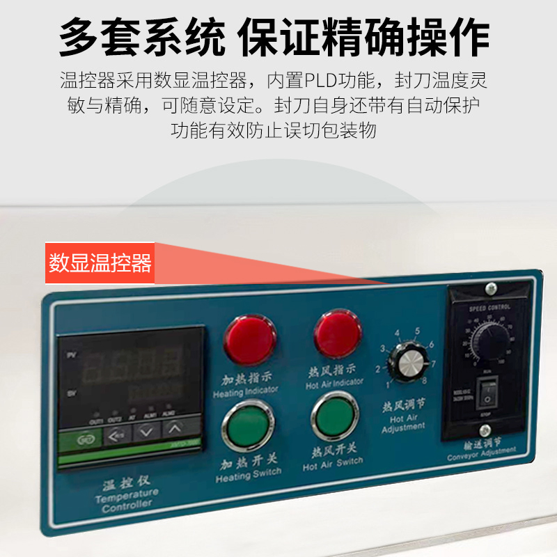 - 收縮爐內的加熱系統(加熱管 / 紅外加熱)將空氣加熱至包裝膜的收縮溫度(通常 80-220℃,根據膜類型調整),同時熱風循環系統(離心風機 + 風道)將熱風均勻吹向膜表面;