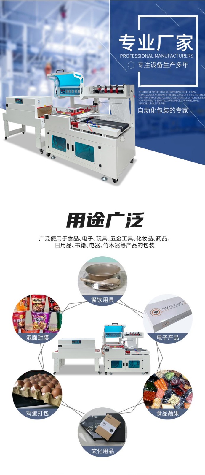 - 全程自動化操作,無需人工封切 / 套膜,單機包裝速度可達30-120 件 / 分鐘(根據產品尺寸調整,小產品速度更快),遠超手動包裝(約 5-10 件 / 分鐘),適合批量生產場景。