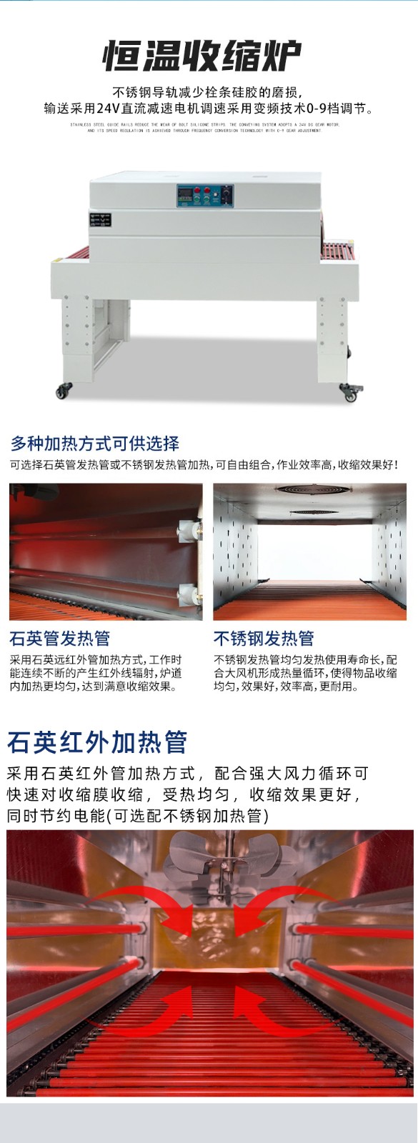 - 收縮爐采用 “不銹鋼保溫爐體 + 熱風循環設計”,熱量流失少,比傳統開放式加熱節能 20%-30%;